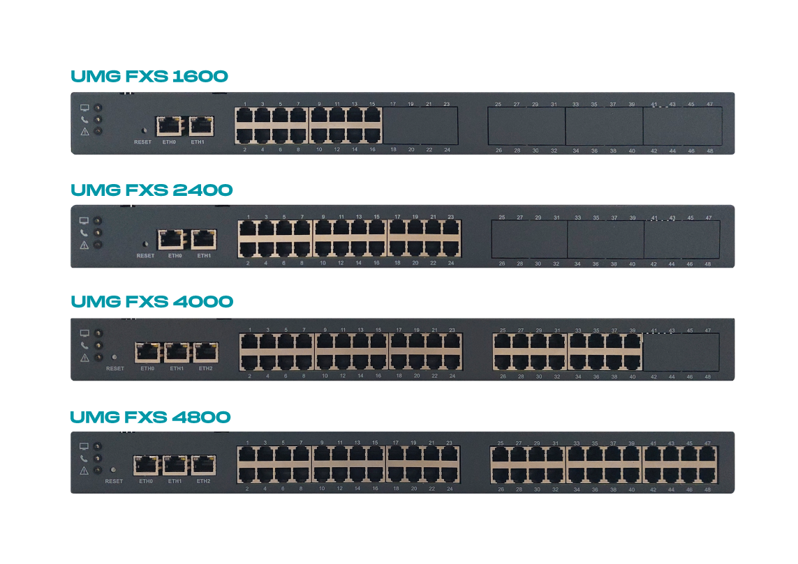 El UMG FXS está disponible en cuatro modelos distintos: UMG FXS 1600, 2400, 4000 y 4800, con un rango de 16 a 48 canales FXS (RJ11) y hasta 3 puertos de red (RJ45). Esta flexibilidad permite responder a diversas necesidades de integración entre la telefonía convencional y VoIP, ofreciendo escalabilidad y rendimiento según las demandas del entorno.