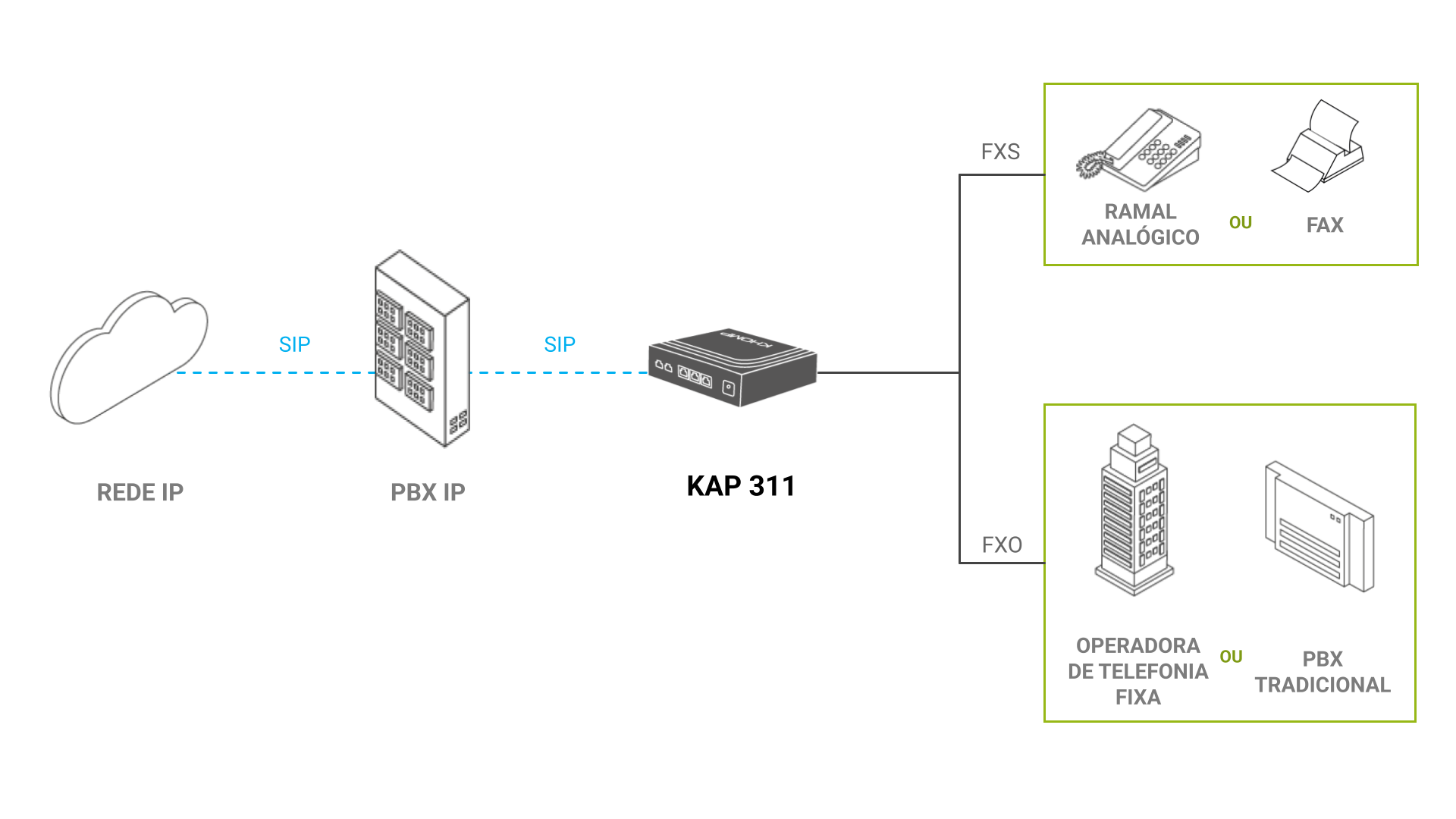 – O KAP 311 tem 1 porta FXO e 1 FXS que convertem portas analógicas em digitais. A porta FXS pode ser usada com um ramal analógico ou fax e a FXO com uma operadora de telefonia fixa ou PBX Tradicional.