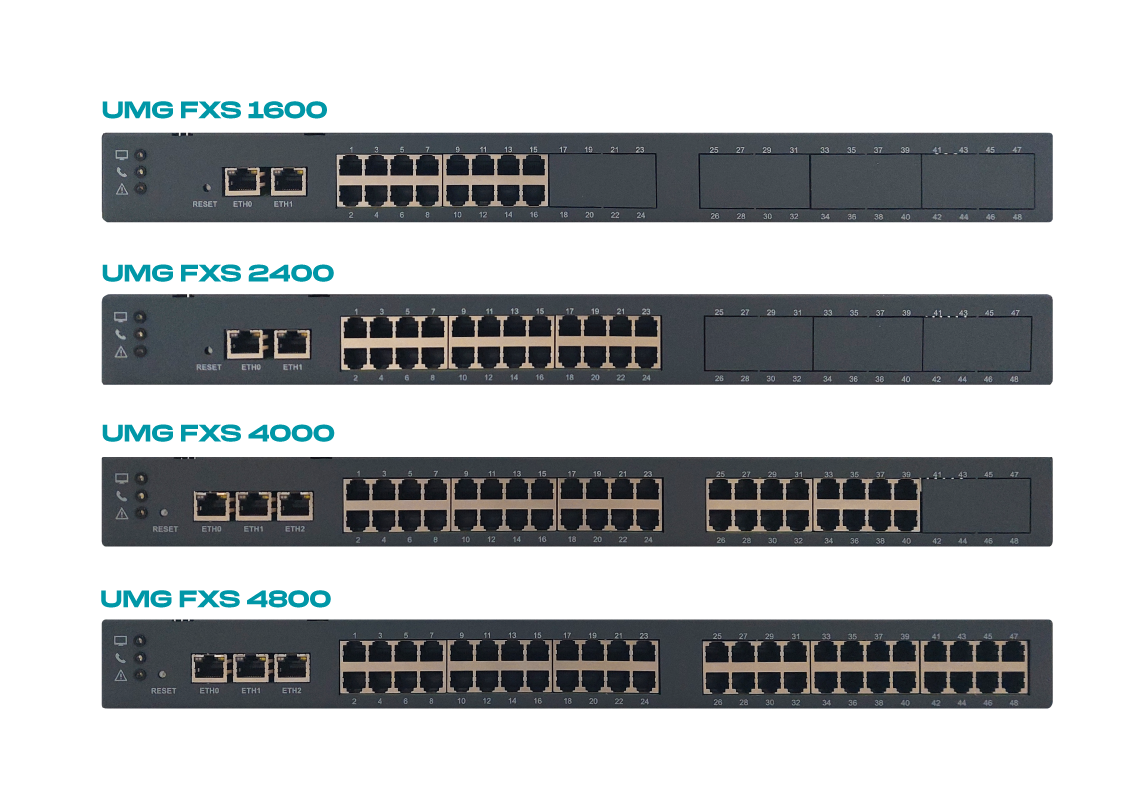 O UMG FXS está disponível em quatro modelos distintos: UMG FXS 1600, 2400, 4000 e 4800, variando de 16 a 48 canais FXS (RJ11) e com até 3 portas de rede (RJ45). Essa flexibilidade permite atender diferentes necessidades de integração entre telefonia convencional e VoIP, oferecendo escalabilidade e desempenho conforme a demanda do ambiente.